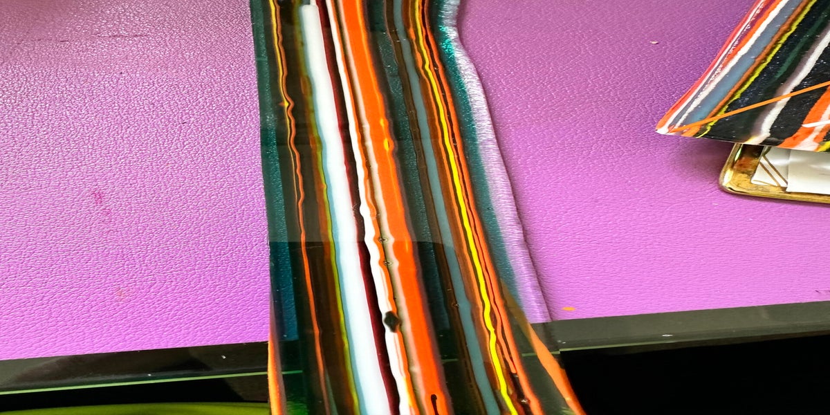The first is working with tapestry. You take a blank piece of glass, add stringers and full fuse. Then you cut it into strips and offset the strips creating interesting movement in color across the piece.